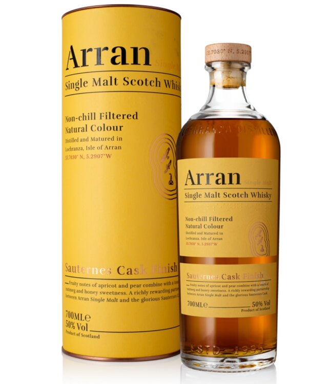 De Arran Sauternes Cask Single Malt Whisky is een ware traktatie voor de liefhebbers van verfijnde Schotse whisky. Deze unieke whisky, afkomstig van het eiland Arran, biedt een bijzondere smaakervaring die je niet wilt missen. Met een alcoholpercentage van 50% en een inhoud van 70cl, is deze